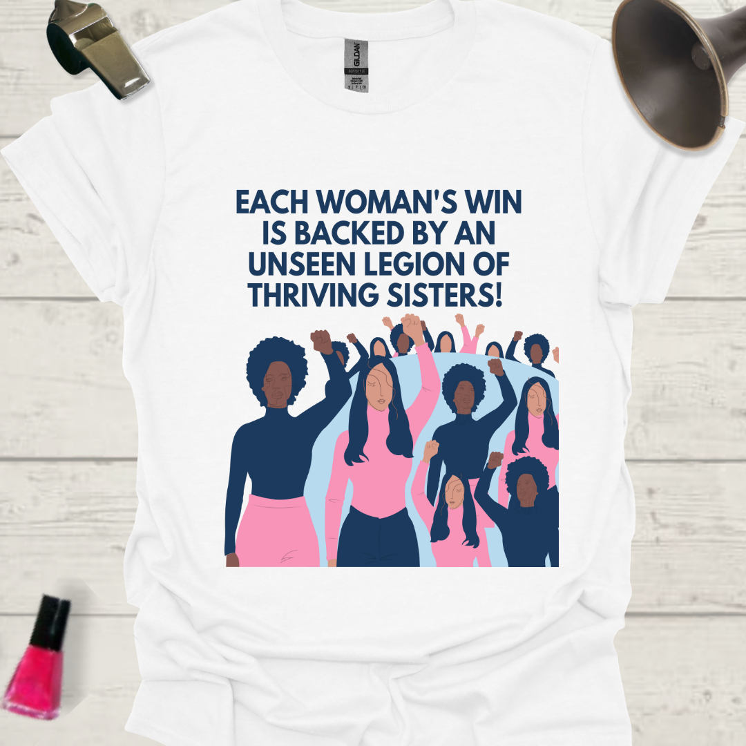 This T-shirt features Each woman's win is backed by an unseen legion of thriving sisters feminist design, giving off a strong and empowering vibe. Perfect for those who support feminist movements and want to make a statement. Ideal for casual wear, activism events, protests, Women's History Month, International Women's Day, and everyday empowerment.