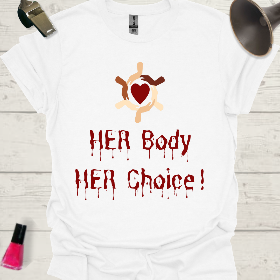 This T-Shirt features a Her Body Her Choice design written with her blood, heart of hands Feminist Design, giving off a strong and empowering vibe. Perfect for those who support feminist movements and want to make a statement. Ideal for casual wear, activism events, protests, Women's History Month, International Women's Day, and everyday empowerment.