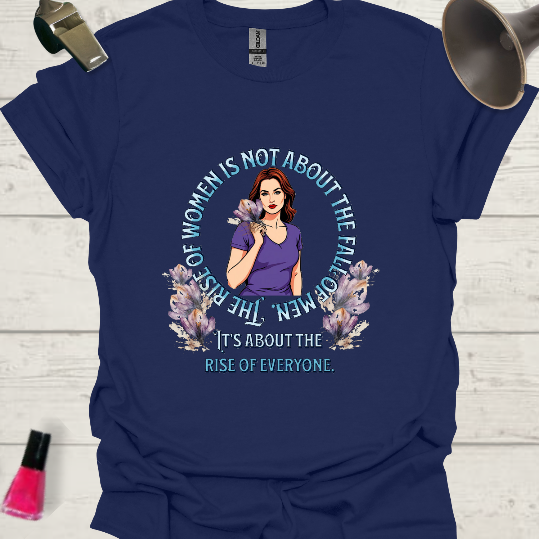 This T-shirt features Women, flowers. The rise of women is not the fall of men. It's about rise of everyone feminist quote design, giving off a strong and empowering vibe. Perfect for those who support feminist movements and want to make a statement. Ideal for casual wear, activism events, protests, Women's History Month, International Women's Day, and everyday empowerment.