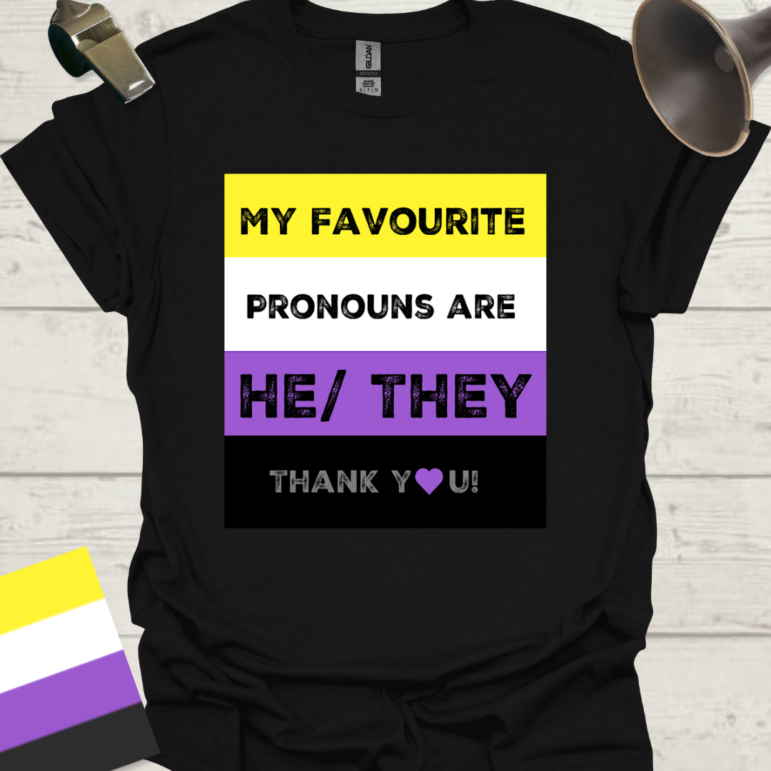 This Unisex T-Shirt features the design 'My favourite pronouns are He They. Thank you, with the non binary flag. It is a versatile and comfortable piece that allows the wearer to express their preferred pronouns proudly. Perfect for those who want to make a statement and promote inclusivity. Suitable for various occasions and celebrations, especially LGBTQ+ pride events and everyday wear.