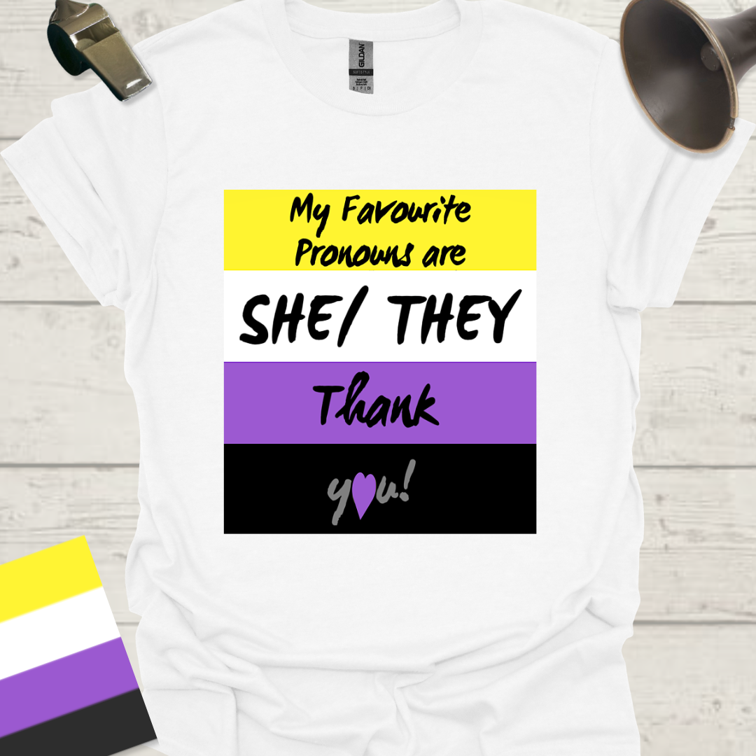 This Unisex T-Shirt features the design 'My favourite pronouns are She They. Thank you! with the non binary flag. It is a versatile and comfortable piece that allows the wearer to express their preferred pronouns proudly. Perfect for those who want to make a statement and promote inclusivity. Suitable for various occasions and celebrations, especially LGBTQ+ pride events and everyday wear.
