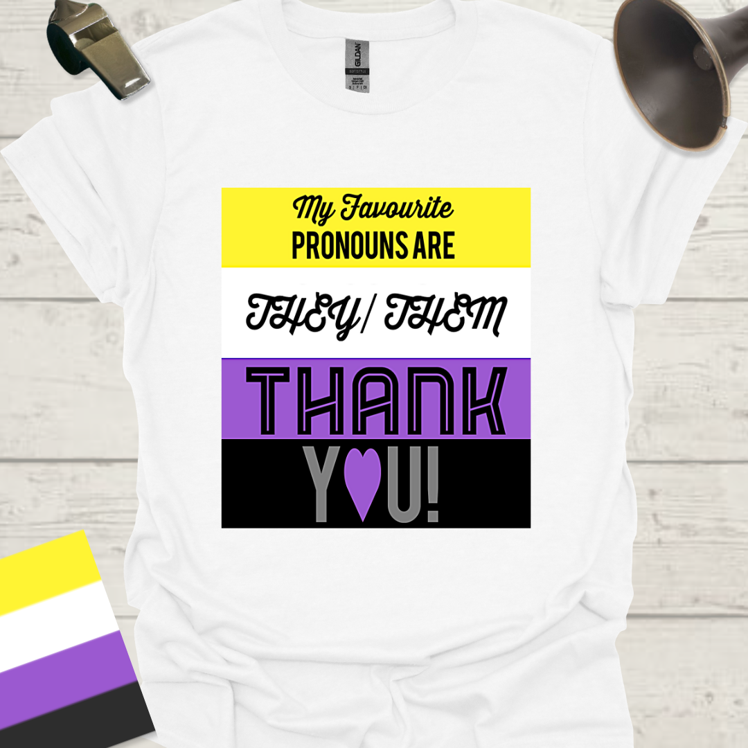 This Unisex T-Shirt features the design 'My favourite pronouns are They Them . Thank you! with the non binary flag. It is a versatile and comfortable piece that allows the wearer to express their preferred pronouns proudly. Perfect for those who want to make a statement and promote inclusivity. Suitable for various occasions and celebrations, especially LGBTQ+ pride events and everyday wear.