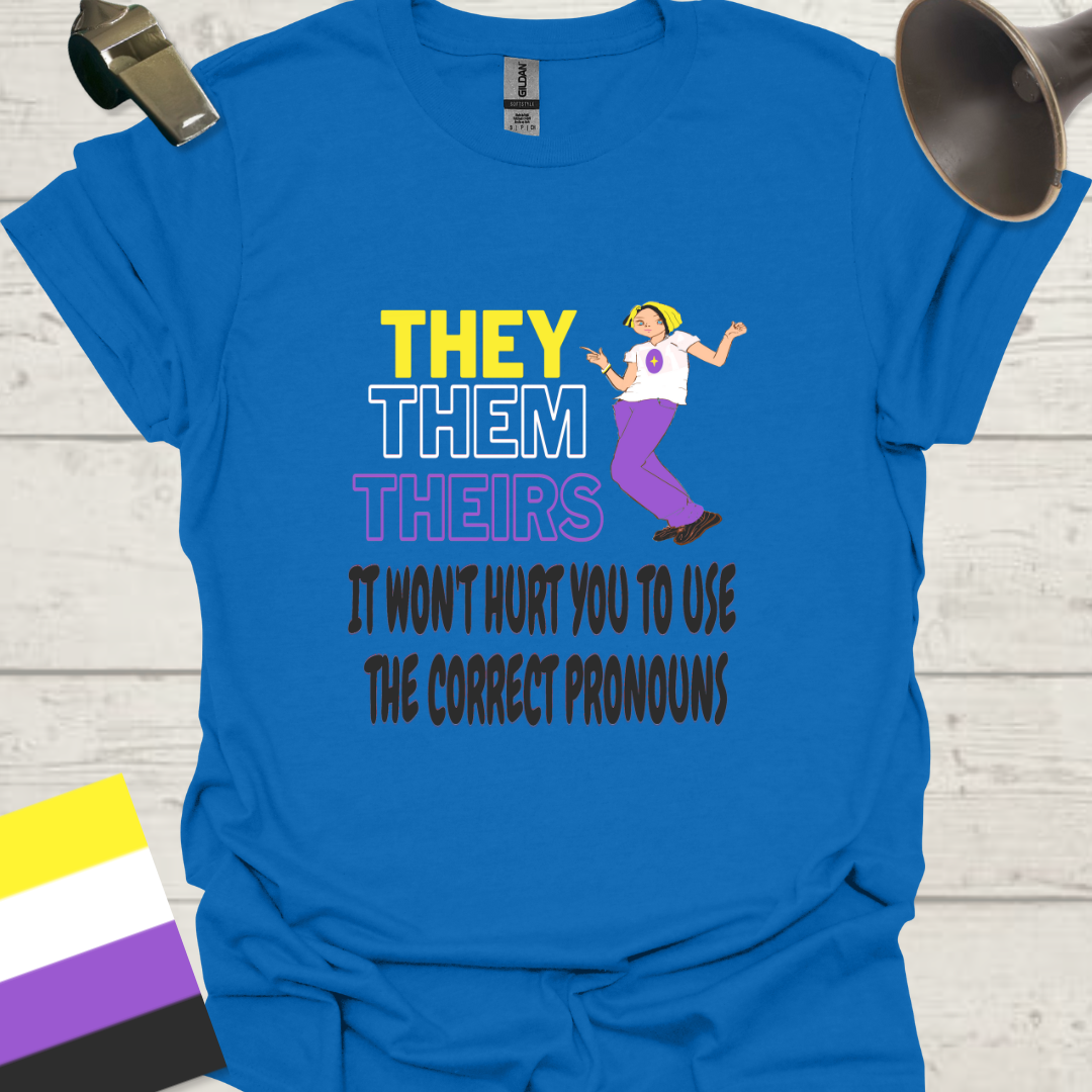 This Unisex T-Shirt features the design 'They Them Theirs It Won't Hurt You To Use the Correct Pronouns, Anime Person, Non-binary flag colors. It is a versatile and comfortable piece that allows the wearer to express their preferred pronouns proudly. Perfect for those who want to make a statement and promote inclusivity. Suitable for various occasions and celebrations, especially LGBTQ+ pride events and everyday wear.