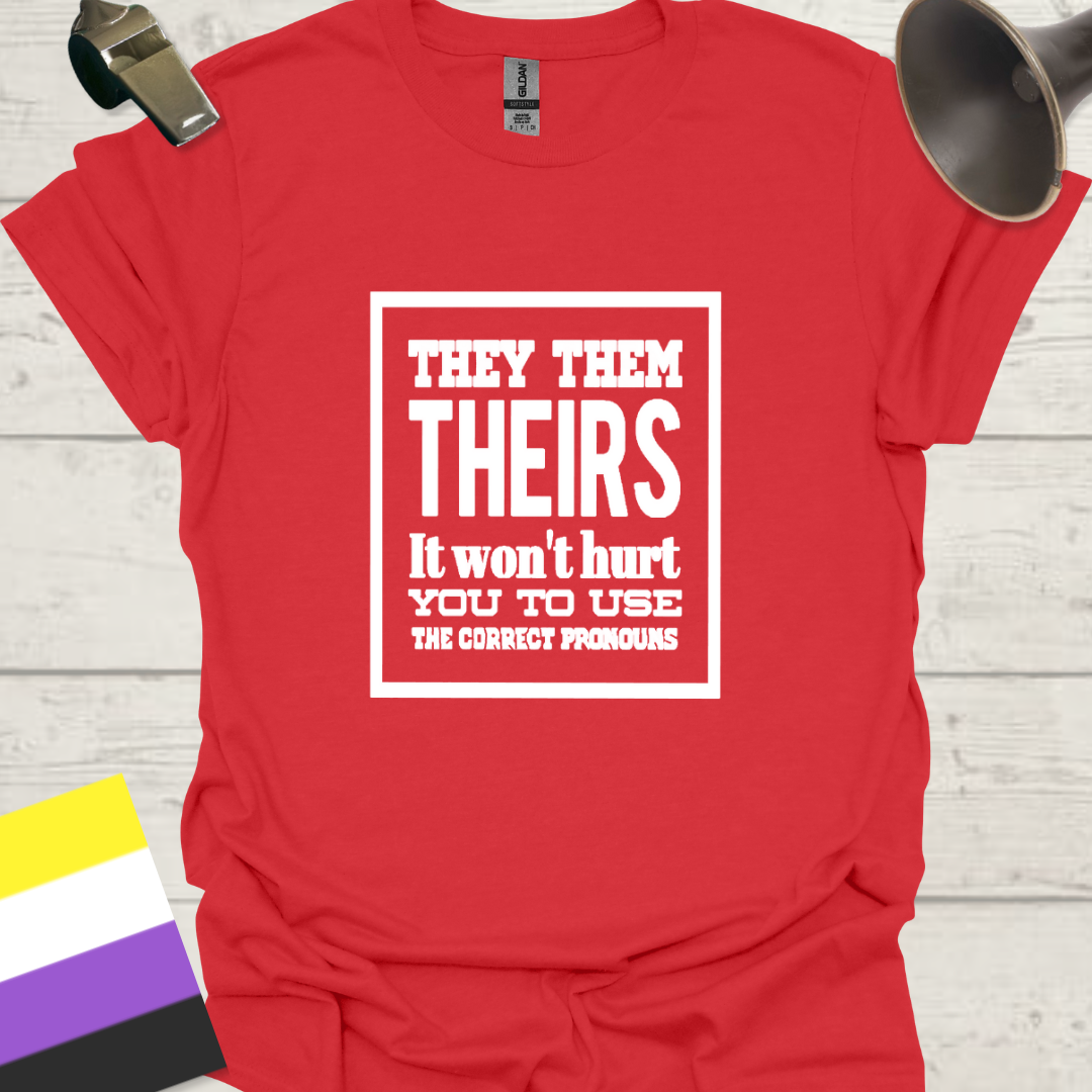 This Unisex T-Shirt features the design 'They Them Theirs It Won't Hurt You To Use the Correct Pronouns. It is a versatile and comfortable piece that allows the wearer to express their preferred pronouns proudly. Perfect for those who want to make a statement and promote inclusivity. Suitable for various occasions and celebrations, especially LGBTQ+ pride events and everyday wear.