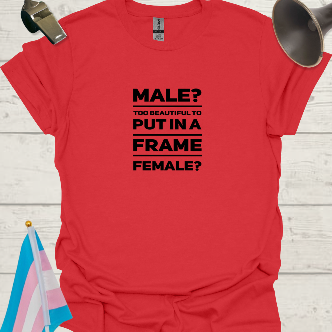 This unisex T-shirt features an 'Male? Too Beautiful to put in a Frame. Female?' LGBT design, making a bold statement of genderfluid, no gender, transition and acceptance. The soft and durable fabric ensures comfort all year round, while the classic fit and crew neckline make it versatile for any occasion. Perfect for adults looking for a meaningful and stylish way to celebrate LGBTQ+ pride.