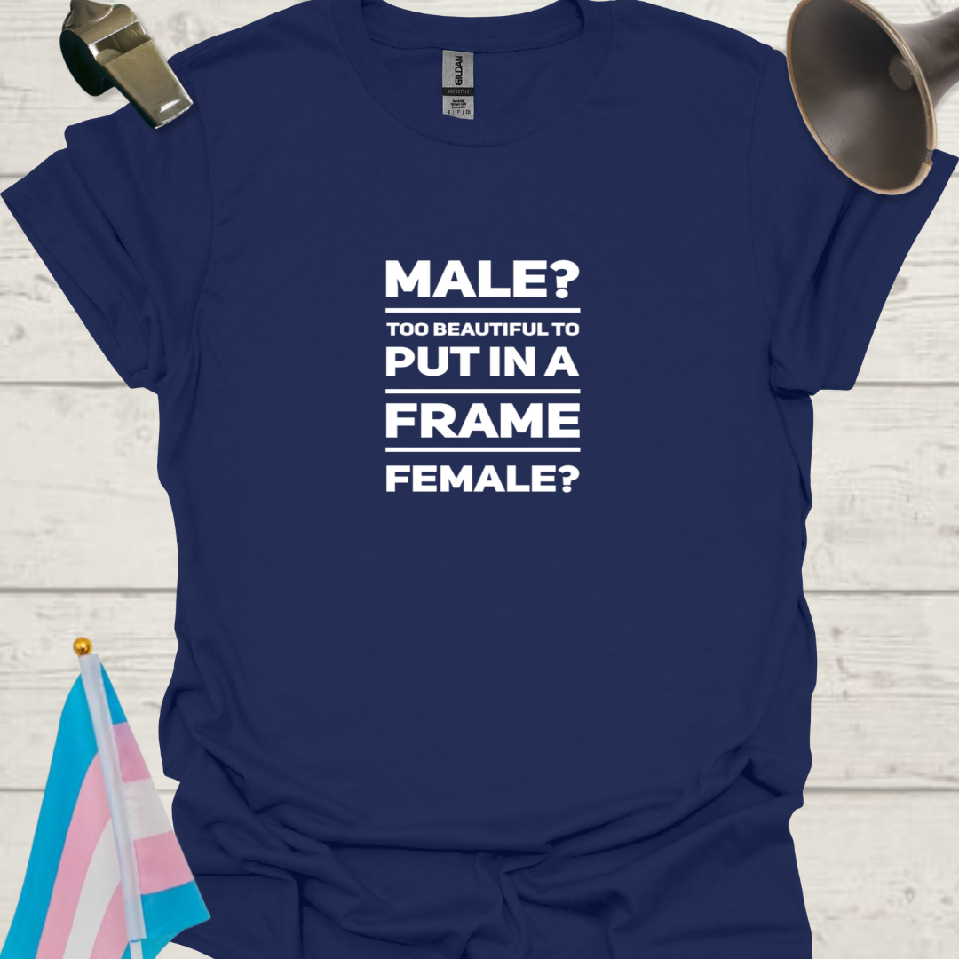 This unisex T-shirt features an 'Male? Too Beautiful to put in a Frame. Female?' LGBT design, making a bold statement of genderfluid, no gender, transition and acceptance. The soft and durable fabric ensures comfort all year round, while the classic fit and crew neckline make it versatile for any occasion. Perfect for adults looking for a meaningful and stylish way to celebrate LGBTQ+ pride.