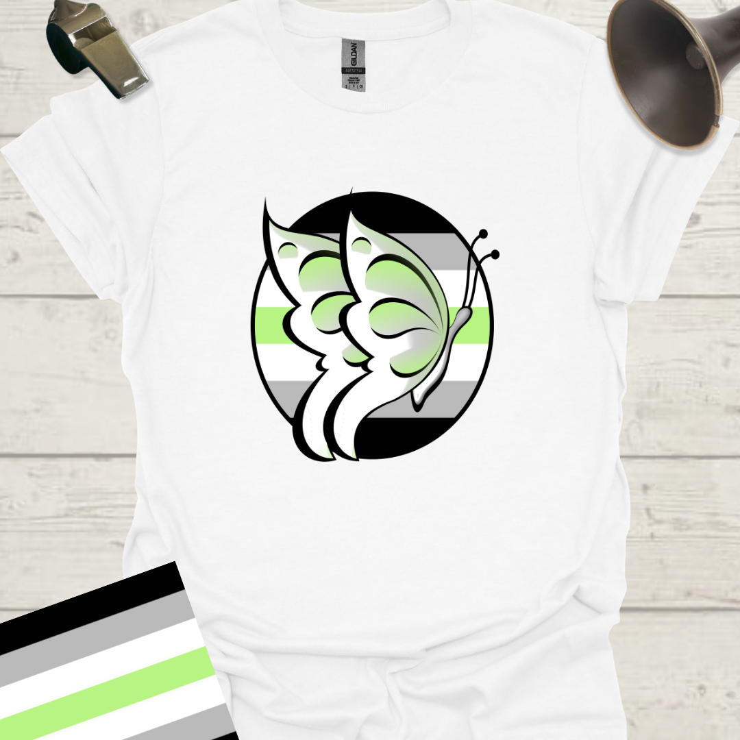 Show your support for the Agender LGBTQIA+ community with this vibrant Butterfly on a Sphere T-Shirt. Made from durable and smooth fabric, this unisex t-shirt is perfect for printing and offers a comfortable fit all year round. The classic crew neckline and clean style make it suitable for any occasion, whether formal or semi-formal. This shirt features the Pride flag colors and is relevant for Pride month celebrations and LGBTQIA+ events.