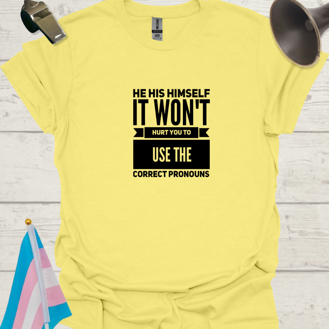Show your support for the LGBT community with this 'He His Himself, It Won't Hurt You to Use the Correct Pronouns' T-Shirt designed for trans men. The unisex softstyle t-shirt is made with 100% ring-spun cotton, providing a lightweight and comfortable feel. The classic fit and crew neckline make it suitable for any occasion, formal or semi-formal. Perfect for adults looking to make a statement and advocate for inclusivity and respect.