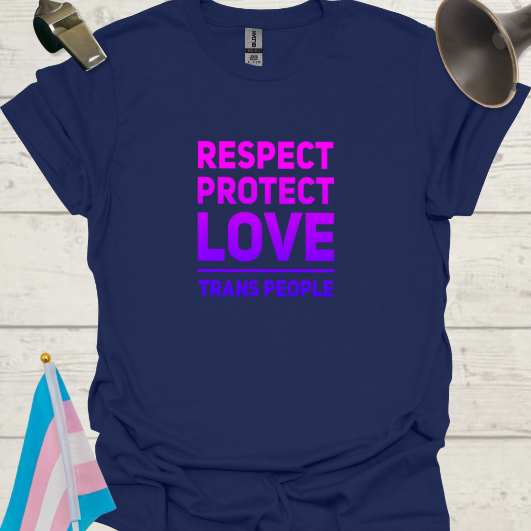 Show your support with this Respect, Protect, Love Trans People t-shirt, featuring a bold LGBT design. This unisex t-shirt made with 100% ring-spun cotton is lightweight, comfortable, and durable, perfect for daily wear. The classic fit and crew neckline make it versatile for any occasion, and the tear-away label adds extra comfort. This t-shirt is ideal for adults looking to express their solidarity with the LGBT community, making it a great choice for pride events, LGBTQ+ celebrations, and everyday wear.